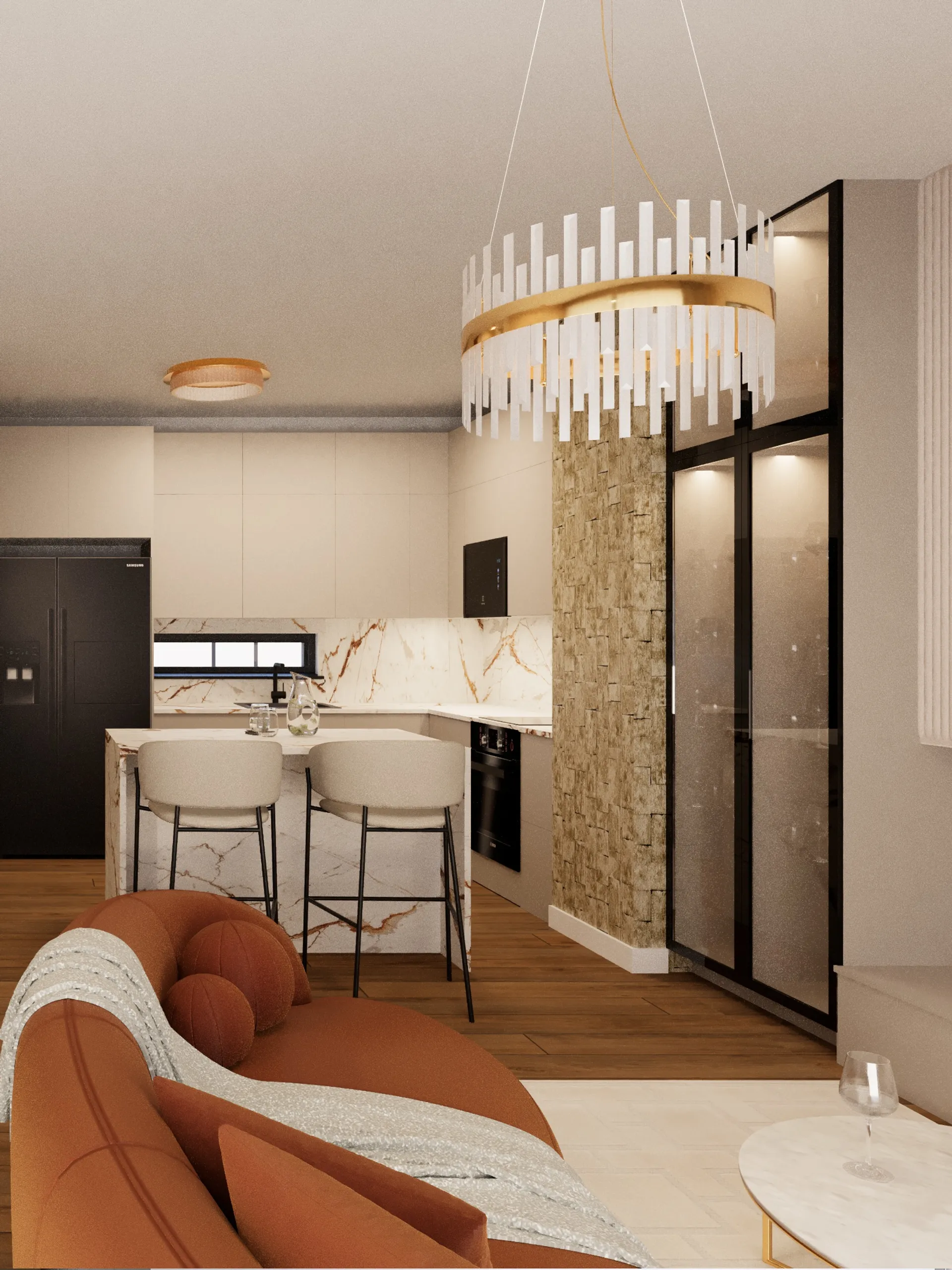 The Warm Home interior design aims to make our homes warmer and more inviting by using rich and warm colors. The color palette applied by the design is specifically neutral, allowing easy pairing with brighter colors, creating a harmonious and friendly atmosphere in our homes. Colors like gray, brown, and beige play a significant role in shaping the color scheme, immediately adding warmth. The use of wood in interior spaces is another simple way to introduce warmth. Proper lighting is crucial for creating a modern yet warm interior. Softly lit table lamps contribute to a calm and relaxing atmosphere, complemented by scented candles for the perfect warm ambiance in any home.